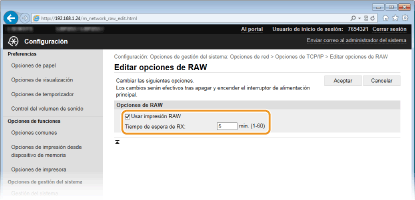 Seleccione la casilla de verificación para imprimir a través de RAW. Cuando no utilice la impresión RAW, quite la marca de la casilla de verificación. [Tiempo de espera de RX]