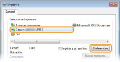[Dispositivos] [Imprimir] la impresora que está usando pulse o haga clic en [Imprimir]Si imprime utilizando este método, únicamente se encontrará disponible un número limitado de opciones de impresión.