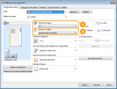 Podrá especificar fácilmente el formato de página, la posición de encuadernación, etc. de una forma intuitiva en la imagen de vista preliminar.Para obtener más información, haga clic en [Ayuda] en la pantalla del controlador de impresora.