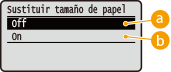 Sustituye el tamaño de papel. Sin embargo, si no hay papel de sustitución en ninguno de los orígenes del papel, no podrá llevarse a cabo la sustitución.