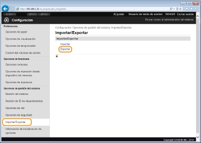 Podrá exportar las opciones del equipo y guardarlas en un ordenador. Se recomienda realizar periódicamente una copia de seguridad de las opciones importantes.