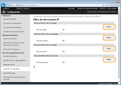 Si las direcciones IP se introducen de forma incorrecta, es posible que no pueda acceder al equipo desde la IU Remota, en cuyo caso deberá establecer <Filtro de direcciones IPv4> o <Filtro de direcciones IPv6> en <Off>. Filtro de direcciones IPv4 Filtro de direcciones IPv6