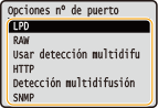 Los puertos sirven como extremos para establecer la comunicación con otros dispositivos. Normalmente, los números de puerto convencionales se utilizan para los principales protocolos, pero los dispositivos que utilizan estos números de puerto son vulnerables a ataques debido a que estos números de puerto son muy conocidos. Para mejorar la seguridad, el administrador de red puede cambiar los números de puerto. Cuando se modifica un número de puerto, el nuevo número debe compartirse con los dispositivos de comunicación, como es el caso de los ordenadores y los servidores. Especifique las opciones del número de puerto en función de su entorno de red.
