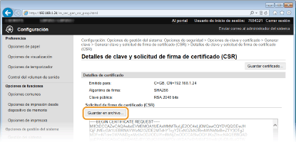 Haga clic en [Examinar], especifique el archivo para la solicitud de firma del certificado y haga clic en [Guardar].