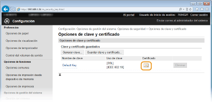 Haga clic en [Opciones de clave y certificado] para verificar un par de claves o en [Opciones de certificado de CA] para verificar un certificado de CA.