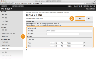기기명과 설치 위치를 비롯하여, 기기 식별에 이용되는 정보를 등록할 수 있습니다. 기기의 AirPrint 기능을 비활성화할 수도 있습니다. 이러한 설정을 변경하려면 리모트 UI를 사용하십시오.