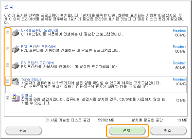 [설명서]를 제외한 모든 확인란의 선택을 해제하고 [설치]를 클릭합니다.