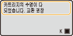 이 메시지가 표시되는 경우를 지정합니다이 메시지를 나타내게하는 토너 카트리지 잔량의 비율을 아무 값이나 설정할 수 있습니다 . 카트리지 준비 알림 표시 타이밍