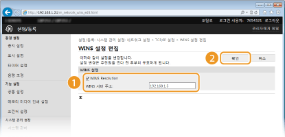 WINS(Windows Internet Name Service)는 NetBIOS 이름(SMB 네트워크 있는 컴퓨터 또는 프린터 이름)을 IP 주소와 연계하는 이름 해독 서비스입니다. WINS를 설정하려면 WINS 서버를 지정해야 합니다.