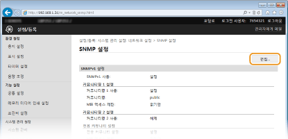 SNMP(Simple Network Management Protocol)는 MIB(Management Information Base)를 사용하여 네트워크의 통신 장치를 모니터링하고 제어하기 위한 프로토콜입니다. 본 기기는 SNMPv1 및 보안 기능이 개선된 SNMPv3을 지원합니다. 문서를 인쇄하거나 리모트 UI를 사용할 때 컴퓨터에서 기기의 상태를 확인할 수 있습니다. SNMPv1 또는 SNMPv3를 각각 또는 동시에 모두 활성화할 수 있습니다. 네트워크 환경과 사용 목적에 맞게 각 버전의 설정을 지정합니다.