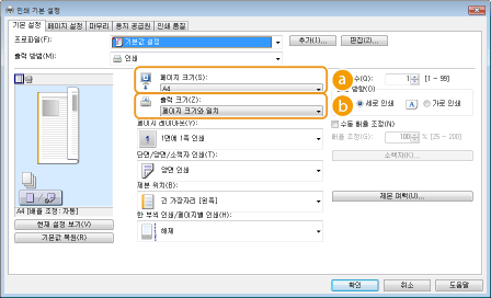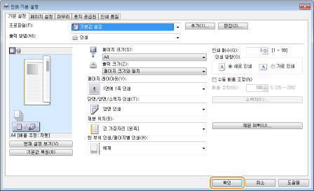 미리보기 이미지에서 페이지 레이아웃, 제본 위치 등을 쉽게 지정할 수 있습니다. 더 자세한 정보는 프린터 드라이브 화면의 [도움말]을 클릭하십시오.