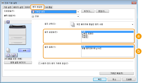 용지 공급장치은 지정된 인쇄 용지의 크기 및 유형과 기기에 구성된 설정에 따라 자동으로 선택됩니다.