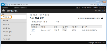 부서 ID 관리 설정에 관계없이 현재 인쇄 중이거나 인쇄 대기 중인 모든 인쇄 문서가 나열됩니다.