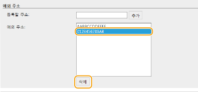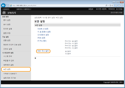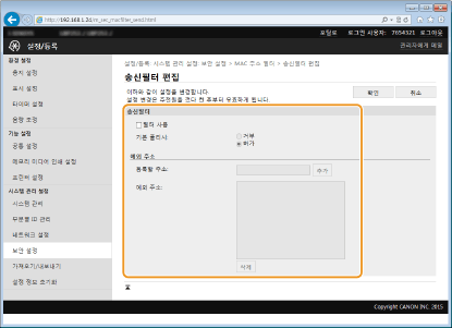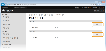 MAC 주소가 잘못 입력되면 리모트 UI에서 기기에 액세스하지 못할 수도 있으며 이런 경우 <MAC 주소 필터>를 <해제>로 설정해야 합니다. MAC 주소 필터