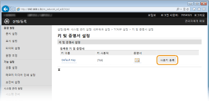 TLS(Transport Layer Security)를 사용하여 기기와 컴퓨터 웹 브라우저 간의 통신을 암호화할 수 있습니다. TLS는 네트워크를 통해 송수신되는 데이터를 암호화하기 위한 메커니즘입니다. IPSec (사전 공유키 방식), IEEE 802.1X 인증(TTLS/PEAP) 또는 SNMPv3에 대한 설정을 지정하는 데 리모트 UI를 사용하는 경우에는 TLS를 반드시 활성화해야 합니다. 리모트 UI에 대해 TLS를 사용하려면 키 쌍을 설정하고 TLS 기능을 활성화해야 합니다. TLS를 활성화하기 전에 TLS에 대한 키 쌍을 생성하거나 설치하십시오 (