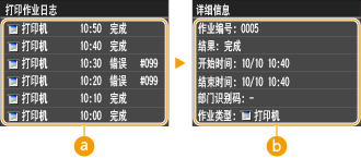 ![]() <打印作业日志>显示已打印文档的列表。文档打印成功时会显示 <完成>,文档打印因取消或出现错误而失败时会显示 <错误>。