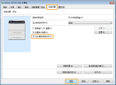 单击 [设备设置] 选项卡,确定选中 [允许使用保密打印] 复选框。