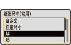 如果装入纸张时未显示以上画面如果一直将相同的纸张装入多功能托盘,通过将纸张尺寸和类型注册为默认设置,可以跳过纸张设置操作。不过,如果注册了默认设置,将不会显示以上画面。若要显示此画面,请选择 <装入纸张时指定> (为多功能托盘注册默认的纸张设置)。