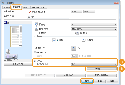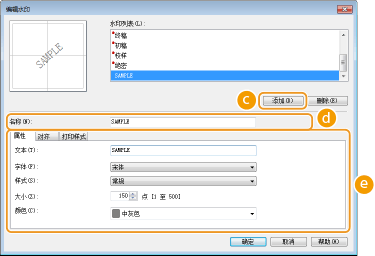 单击各选项卡指定水印的文本、颜色或打印位置。更多信息,请单击打印机驱动程序画面上的 [帮助]。