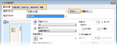单击 [基本设置]、[页面设置]、[完成方式]、[纸张来源] 或 [质量] 选项卡,根据需要在各画面上指定打印设置。