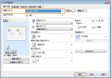 每次打印时指定“在A4尺寸纸张上单面横向”等设置组合可能会比较耗时。如果将常用的打印设置组合注册为“配置文件”,只需从列表中选择配置文件之一即可指定打印设置。本节说明了如何注册配置文件和如何使用配置文件进行打印。