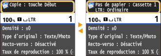 <Réglages papier>Ce bouton permet également de définir le format et le type du papier figurant dans la cassette à papier et le bac multifonctions. Spécification du format et du type de papier
