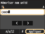 Saisissez le nom de l'émetteur (nom d'utilisateur ou de société) au moyen des touches numériques, puis appuyez sur <Appliquer>.