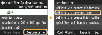 Si votre bureau dispose d'un serveur LDAP, vous pouvez définir un destinataire au moyen des informations utilisateur qui y sont stockées. Accédez au serveur LDAP à l'aide de l'appareil pour rechercher les informations utilisateur, puis définissez-les en tant que destinataires.
