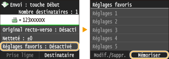Pour modifier ou supprimer les paramètres enregistrés, accédez à <Fax>  <Réglages favoris>  <Modif./Suppr.>  <Modifier> ou <Supprimer>, puis suivez les étapes ci-après.