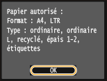 Contrôlez que le format et le type du papier mentionnés à l'écran correspondent au papier chargé dans l'appareil et appuyez sur <OK>.
