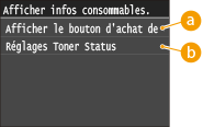 Si vous ne souhaitez pas utiliser l'état du toner, sélectionnez <Désactivé>. Pour éviter qu'un bouton qui permet d'accéder à des sites d'achat de cartouches de toner ne s'affiche dans l'état du toner, sélectionnez <Activé> puis <Désactivé>.