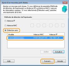 ![]() Vous ne pouvez ajouter un port MFNP que si vous avez installé le pilote d'imprimante ou de fax à partir du DVD-ROM fourni ou bien à partir du site Web Canon.