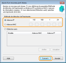 Cliquez sur [Actualiser]. Si le problème persiste, sélectionnez [Adresse IP] ou [Adresse MAC], saisissez l'adresse IP ou MAC de l'appareil (Affichage des réglages réseau), puis cliquez sur [Suivant].