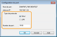 Il s'agit d'un port Windows standard. Lorsque vous utilisez ce type de port, vous devez ajouter un nouveau port dès que l'adresse IP de l'appareil est modifiée. Sélectionnez ce type de port lorsque vous utilisez l'appareil dans un environnement IPv6 et lorsque vous ne pouvez pas ajouter un port MFNP.
