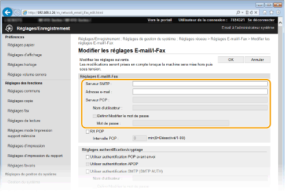 Utilisez l'interface distante pour définir les paramètres détaillés d'envoi et de réception, notamment les paramètres d'utilisation de l'appareil pour l'envoi et la réception des I-Fax et les paramètres d'authentification POP ainsi que le cryptage avant tout envoi d'e-mails ou d'I-Fax. Contactez votre fournisseur ou votre administrateur réseau pour les paramètres requis.