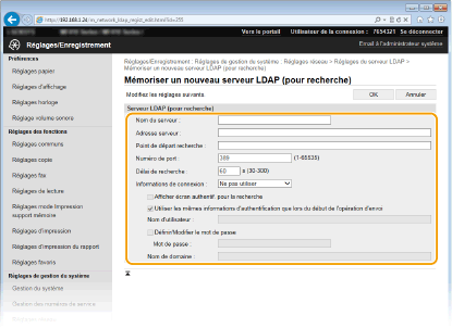 L'enregistrement de serveur LDAP est distinct, avec un enregistrement soit pour la recherche soit pour l'authentification. Pour utiliser un serveur pour la recherche de destinataire de fax et d'e-mails, enregistrez-le pour la recherche, et pour l'utiliser pour l'envoi d'authentification d'e-mail ou de fax, enregistrez-le pour l'authentification.