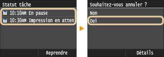 Annulation à partir de l'IU distanteVous pouvez annuler l'impression dans la page [Statut tâche] de l'interface utilisateur distante : Vérification de l'état actuel des documents d'impression
