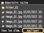 ![]() ![]() Lorsque vous sélectionnez <Date/Heure (Croissant)> ou <Date/Heure (Décroissant)>, le classement des fichiers s'effectue selon la date et de l'heure de modification des fichiers.