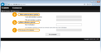 Sélectionnez [Mode administrateur système] ou [Mode utilisateur général], puis saisissez une valeur dans [PIN d'accès à l'IU distante].