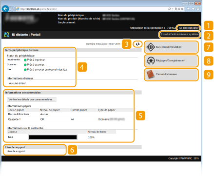 Affiche l'état actuel de l'appareil et les informations d'erreur. En cas d'erreur, le lien vers la page Informations d'erreur apparaît.