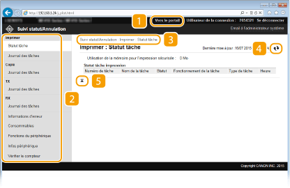 Affiche l'état des documents d'impression courants ainsi que l'historique des documents imprimés, envoyés ou reçus. Vous pouvez également examiner l'état de l'appareil.