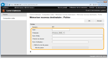 Vous pouvez utiliser l'ordinateur pour enregistrer des destinataires dans le carnet d'adresses de l'appareil, puis modifier les informations des destinataires enregistrés. Configurez le dossier partagé ou l'adresse du serveur FTP ici.
