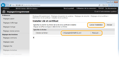Cliquez sur [Réglages clé et certificat] pour installer une paire de clés, ou sur [Réglages certificat CA] pour installer un certificat CA.
