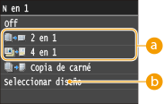(Ampliación o reducción), pero es posible que los lados del documento no se copien si la aumenta.<2 en 1>/<4 en 1> no estará disponible cuando se utilice <Borrar marco> o <Copia de carné>.