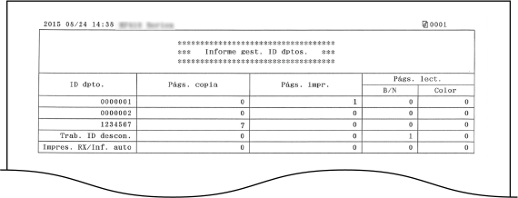Cuando está habilitada la Administración de ID de departamento, puede consultar el volumen total de impresiones de cada <ID de departamento> imprimiendo un Informe gestión de ID de departamentos.Al consultar el total de impresiones, podrá gestionar mejor los suministros de papel y cartuchos de tóner.