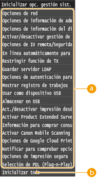 Si se inicializan las opciones de la IU remotaEl PIN de acceso a la IU remota también se inicializa.Tras una inicialización, vuelva a establecer el PIN de acceso a la IU remota. Configuración de un PIN para la IU Remota