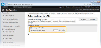 Seleccione la casilla de verificación para imprimir a través de LPD. Cuando no utilice la impresión LPD, quite la marca de la casilla de verificación. [Usar impresión RAW]