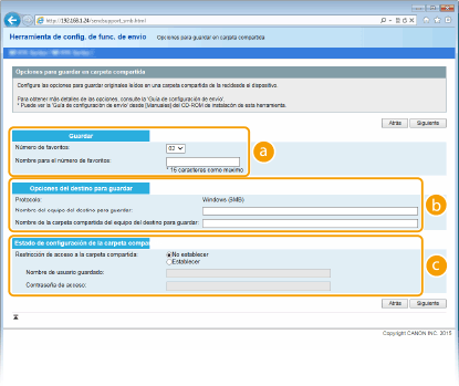 Configuración de SMB). Para configurar el equipo de modo que guarde los documentos leídos en una carpeta compartida en la red a través de SMB, primero especifique la ubicación de la carpeta compartida desde un ordenador. En esta sección se describe cómo especificar la ubicación para guardar utilizando la Herramienta de configuración de la función de envío.