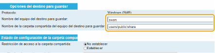 Haga clic en el botón de opción [No establecer] o [Establecer] según las restricciones de acceso establecidas en la carpeta compartida. Si selecciona [Establecer], introduzca el nombre de usuario en el cuadro de texto [Nombre de usuario guardado] y la contraseña en el cuadro de texto [Contraseña de acceso].