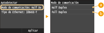 pulse <Half Duplex> o <Full Duplex>.![]() <Half Duplex>Envía y recibe datos de comunicación de forma alternativa. Seleccione cuándo se conecta el equipo a un dispositivo de red utilizando Half Duplex.